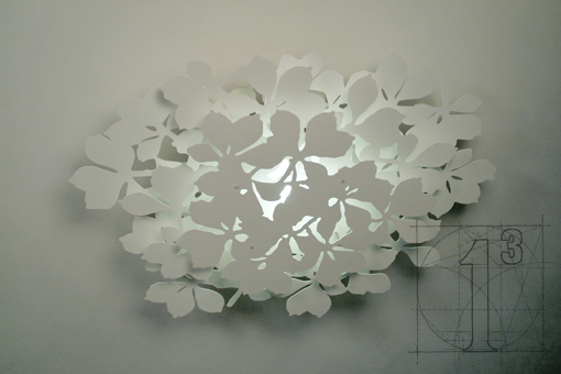 Le lustre frondaison propose de recréer la sensation de vivre sous un arbre. Imaginé comme le feuillage d'un arbre par une nuit de pleine lune, ce luminaire prend sa forme dans une superposition de quatre plaques d'aluminium laqué découpées et éclairées de l'intérieur par une ampoule lumière du jour de basse consommation.