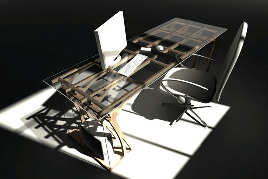 Le Bureau 01 de la gamme PORTANCE est un dispositif de support de plateaux. Véritable squelette de l'usage, il s'inspire des structures de ponts et des mécanismes ostéologiques humains, il permet d'utiliser le multiplis de bouleau pour obtenir une structure porteuse d'une grande finesse, légèreté et Solidité. Cela permet de profiter au mieux de l'usage d'un plateau en verre, de libérer la circulation des jambes et de créer des zones hors-sol accueillant ordinateur et périphériques informatiques.