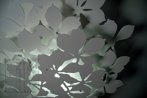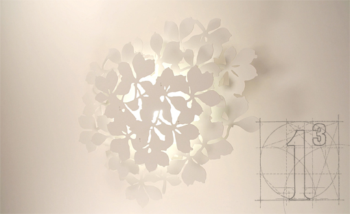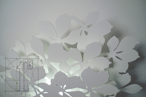 D’un point de vue technique le lustre frondaison est composé de quatre plaques d’aluminium recyclé de 2mm d’épaisseur découpées au laser et laqué blanc mat. Chacune de ces plaques est distancée des autres par des entretoises de 50 mm de long.