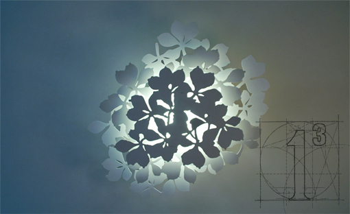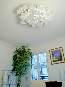 Le lustre frondaison propose de recréer la sensation de vivre sous un arbre. Imaginé comme le feuillage d'un arbre par une nuit de pleine lune, ce luminaire prend sa forme dans une superposition de quatre plaques d'aluminium laqué découpées et éclairées de l'intérieur par une ampoule lumière du jour de basse consommation.