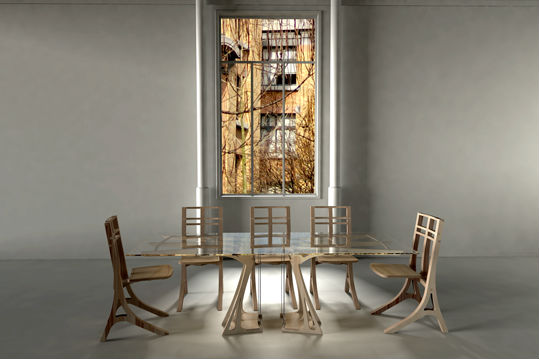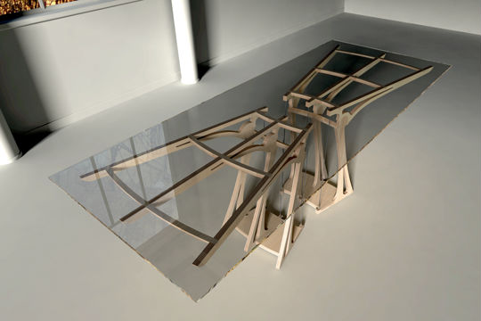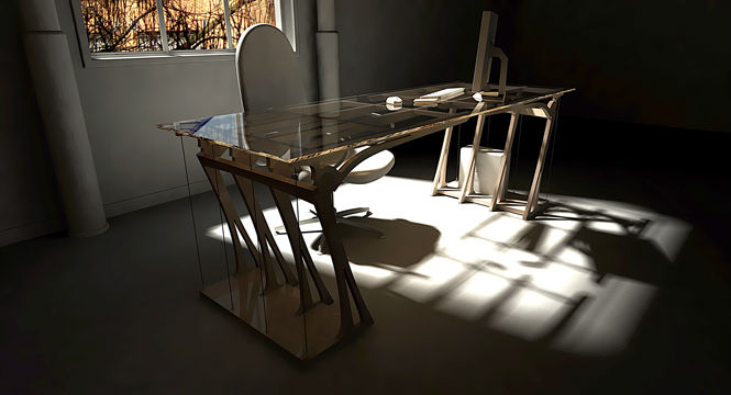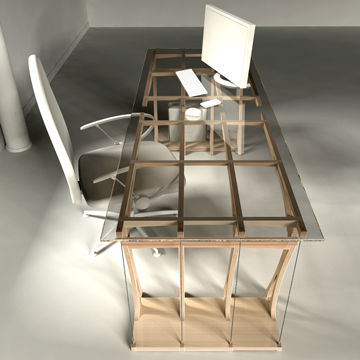 Le Bureau 01 de la gamme PORTANCE est un dispositif de support de plateaux. Véritable squelette de l'usage, il s'inspire des structures de ponts et des mécanismes ostéologiques humains, il permet d'utiliser le multiplis de bouleau pour obtenir une structure porteuse d'une grande finesse, légèreté et Solidité. Cela permet de profiter au mieux de l'usage d'un plateau en verre, de libérer la circulation des jambes et de créer des zones hors-sol accueillant ordinateur et périphériques informatiques.